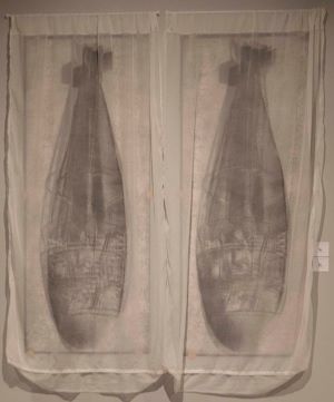 Не могат да се отминат, без да бъдат забелязани графичните силуети, центрирани срещу входа, които поразяват с размерите си /сравними с човешки ръст/, но и с материала, върху който е отпечатано графич-ното изображение – текстил: