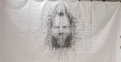 Още по-впечатляващо, почти смущаващо е следното изображение, също отпечатано върху текстил, но размерът е още по-впечатляващ – заема почти цяла стена на огромната зала: