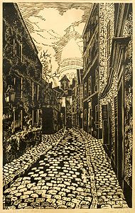 Парижка улица, гравюра на дърво-хартия 36х22