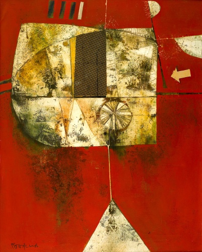 В нея също присъстват символно-графични знаци. Фрагментарно решение за основното изображение, решено в землисто-охрената гама, предпочината от автора. Но колко различно, колко хладно е общото послание! Макар спрялото време да говори за замръзнала статичност в първото платно, животът в него тупти – той още съществува в своята капсула – махалото още може да излезе от неравновесното си състояние.